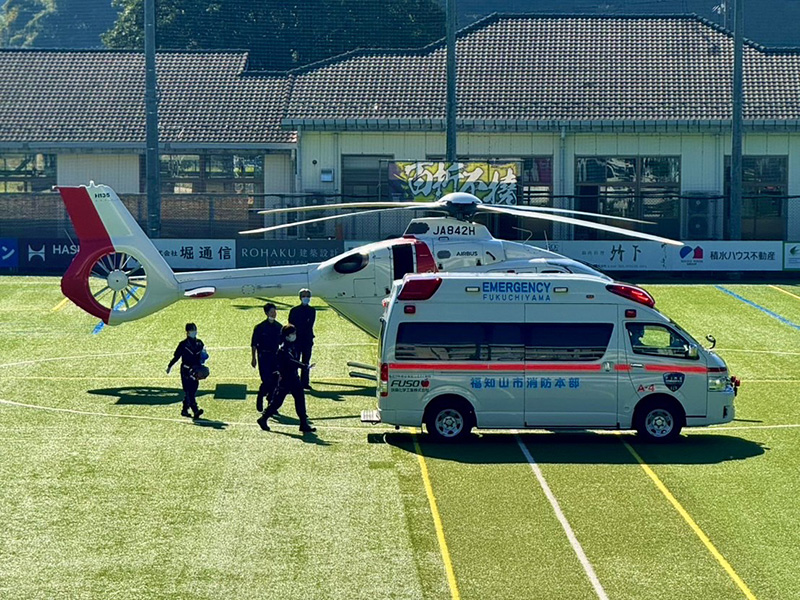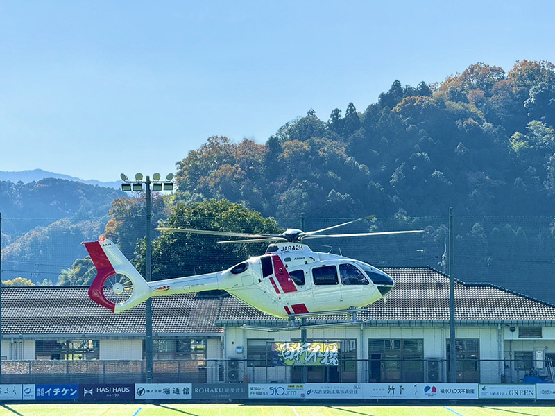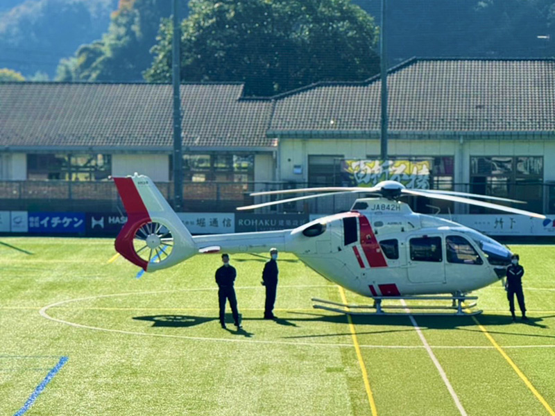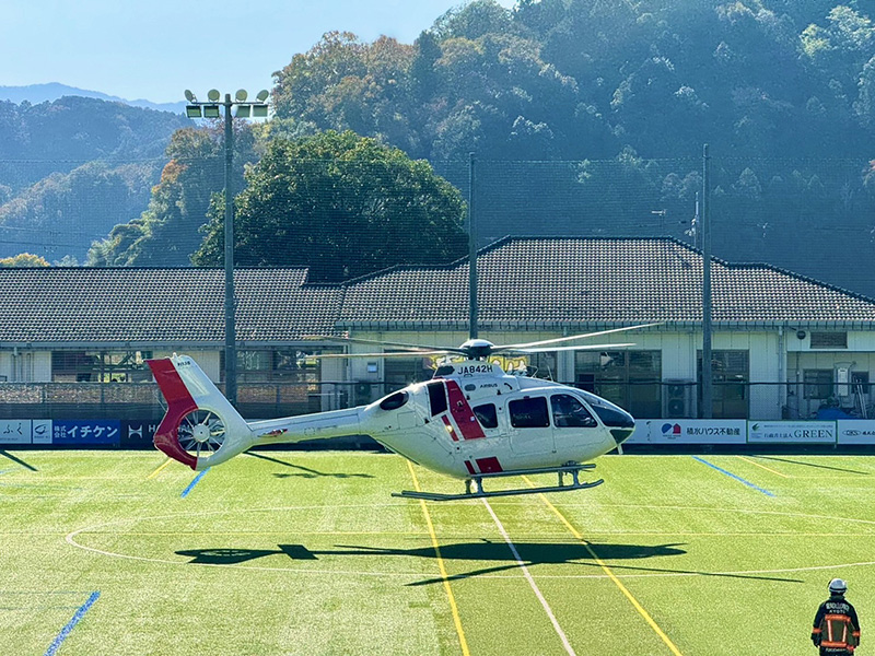 S-LABの人工芝グラウンドは、福知山市と医療機関の連携により、緊急時にドクターヘリが着陸できる臨時ヘリポート として利用されています。
